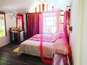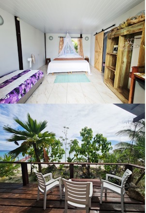 Ce bungalow en bord de plage est l?unité la plus proche des espaces communs de la maison d?hôtes, comprenant la réception et la salle à manger. Il offre le même niveau de confort que nos autres bungalows, avec une moustiquaire, un ventilateur, un coffre-fort et un mini-réfrigérateur. La salle de bain privée est équipée d?une douche et de toilettes pour votre confort. Détendez-vous et profitez de la superbe vue sur le lagon depuis votre terrasse privée.